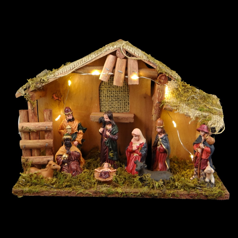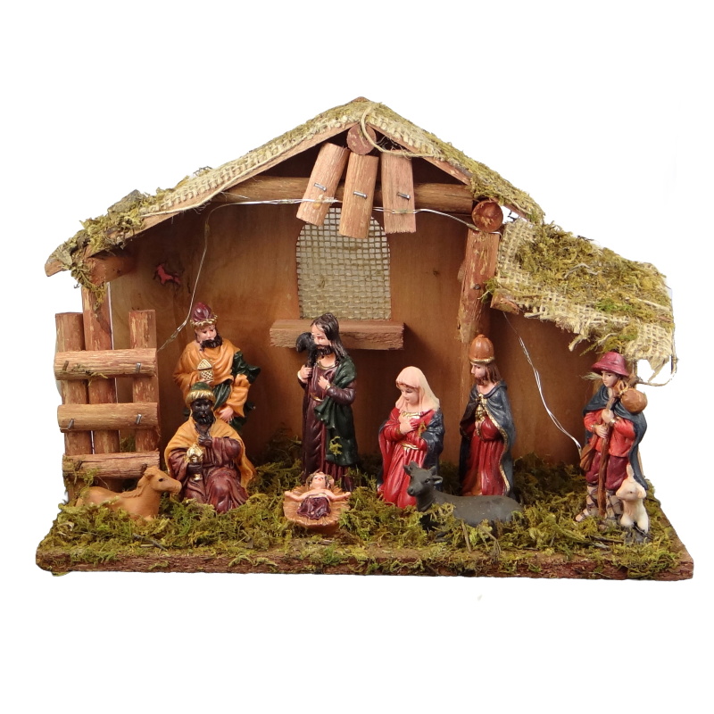 Tradiční vánoční betlém vyrobený ze dřeva s barevnými figurkami z materiálu polyresin, svítící 7 led diodami. Betlém svítí s využitím 3 knoflíkových baterií, které jsou součástí balení, Svítící betlém bude krásná vánoční dekorace v každém interiéru.